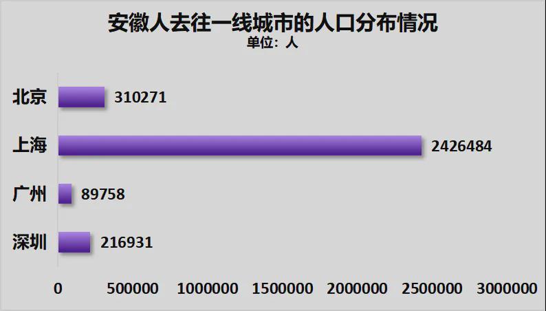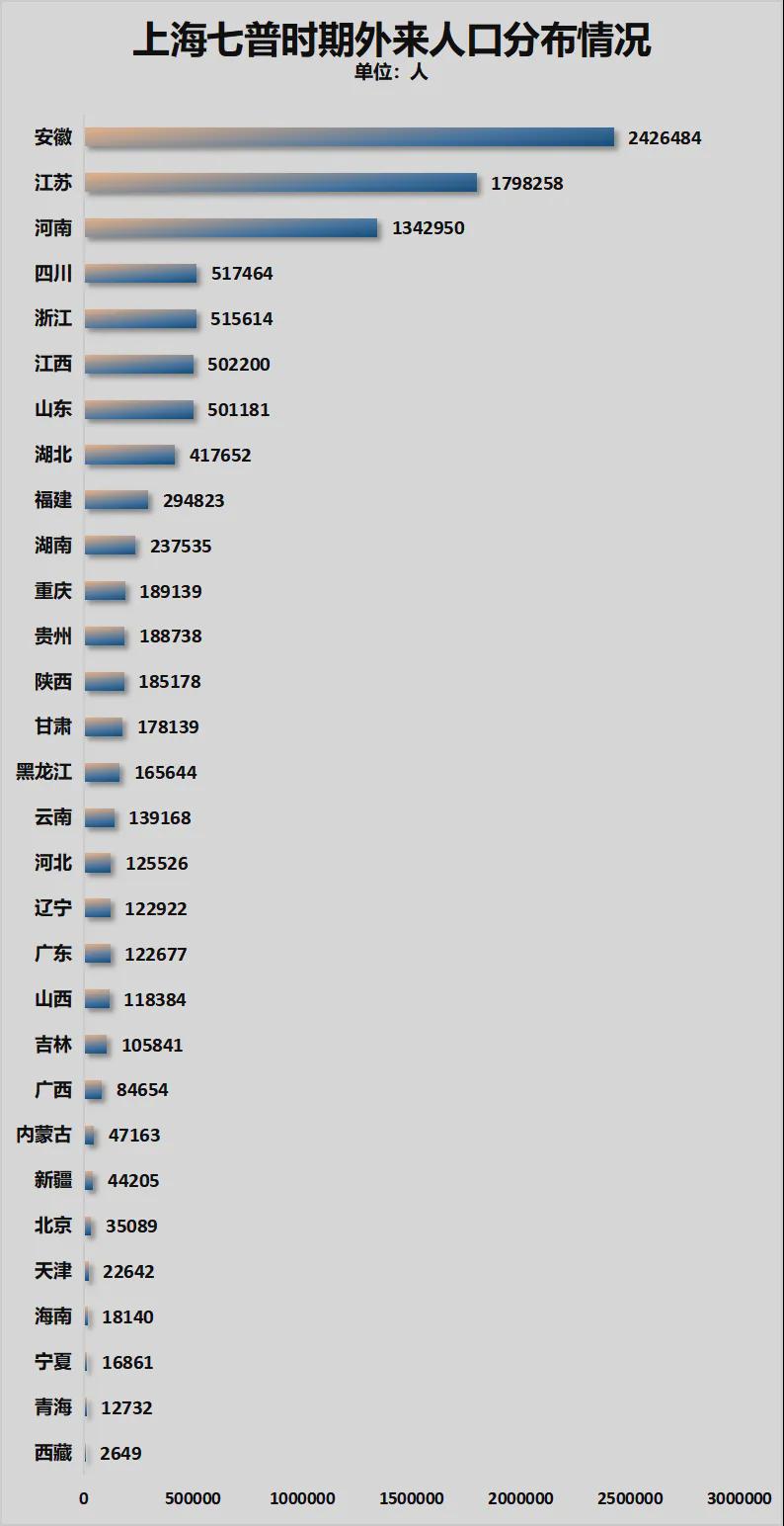 上海七普期间有1047。97万外来生齿。此中安徽人最多,高达242。65万人,差不多上海每四个外来生齿中,就有一个是安徽人。