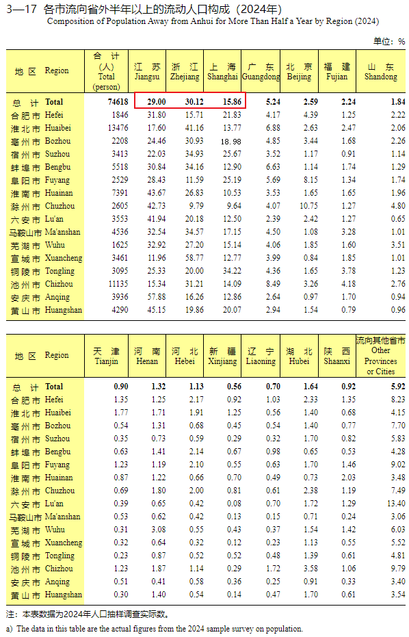 安徽省统计局发布的年鉴数据显示,2024年流向外省的74618人,有30。12%流向了浙江,29%流向了江苏,15。86%流向了上海。
