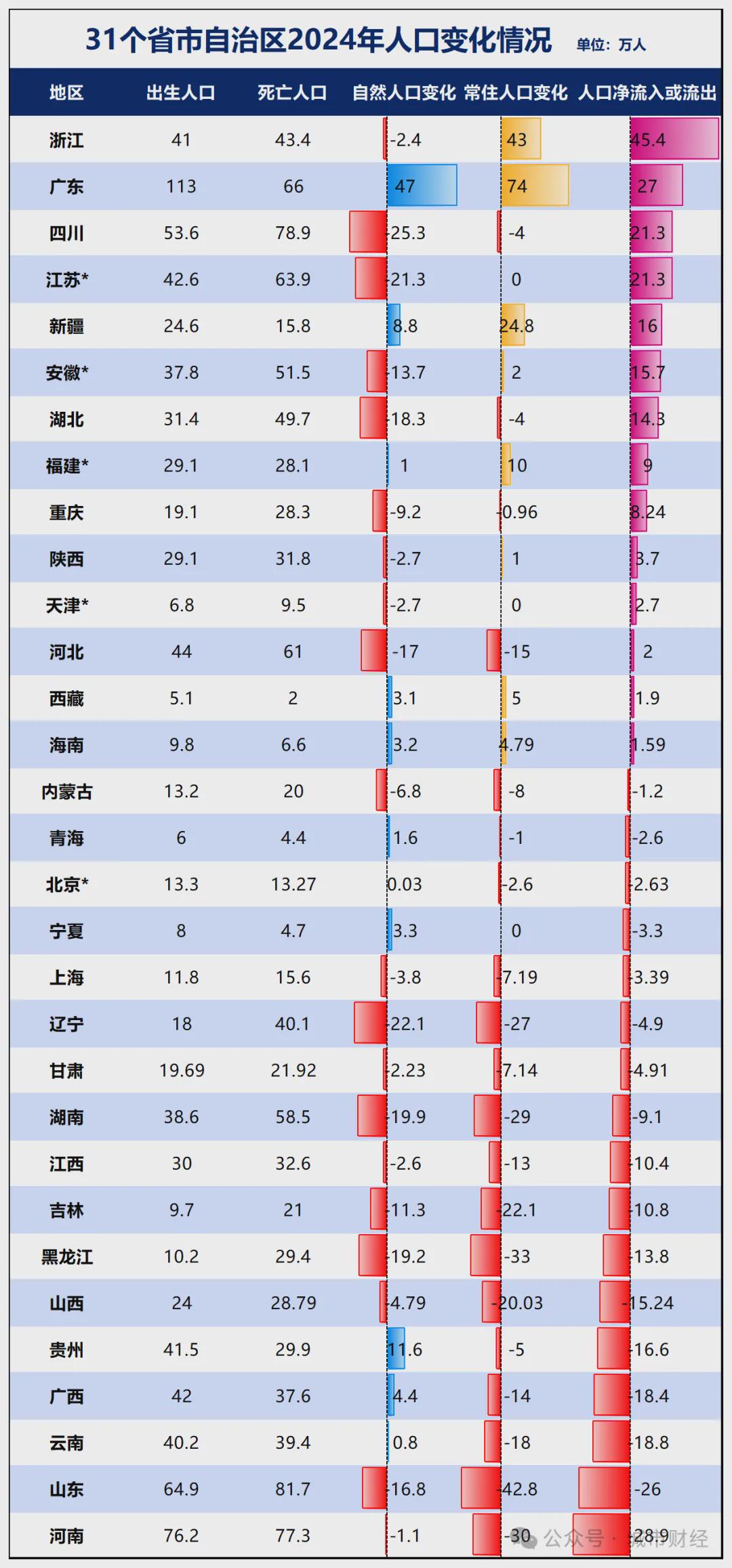 制图:城市财经;数据:各省市自治区统计局;此中带*的地域,未发布间接出生生齿取灭亡生齿数据,是按照发布的出生率取灭亡率计较得出。